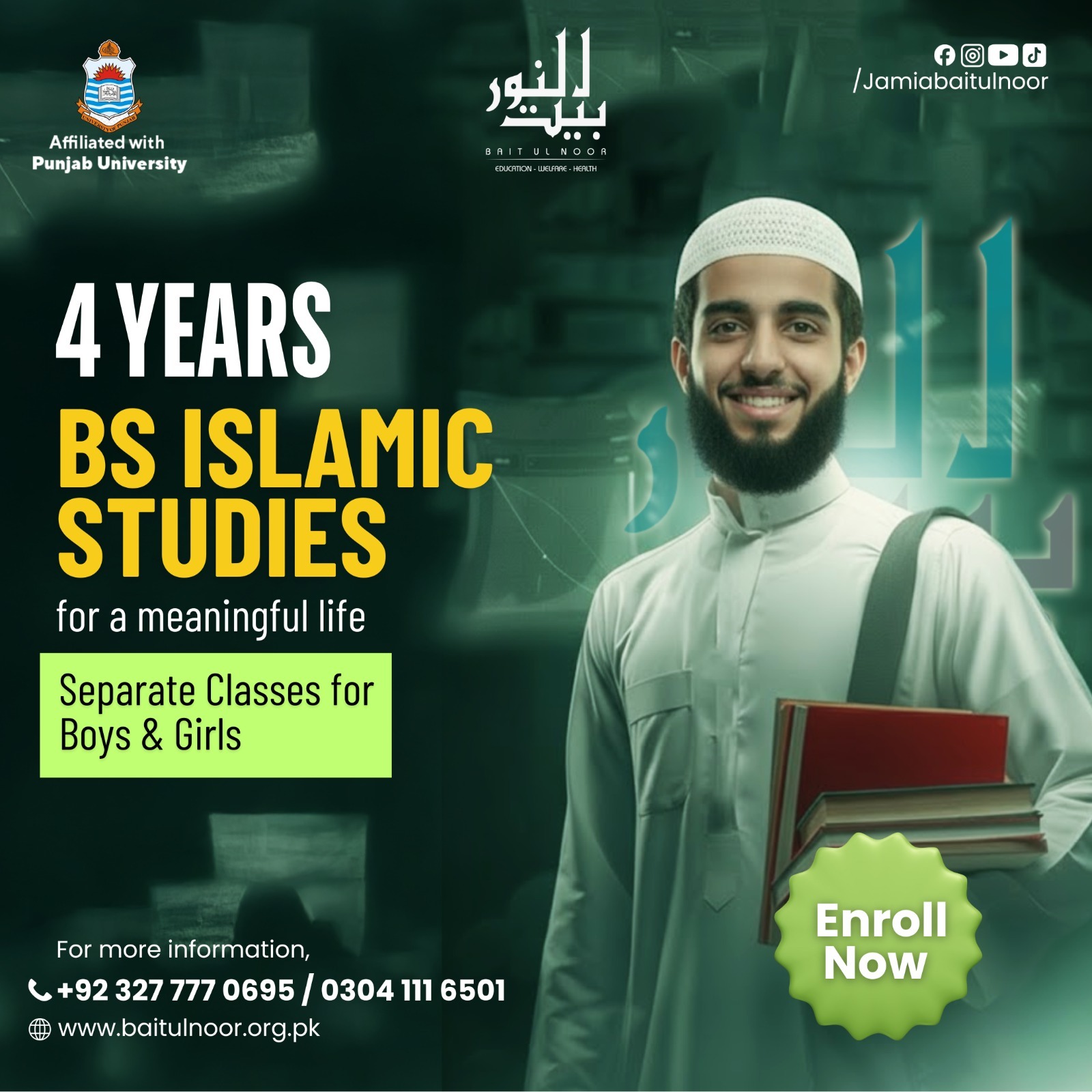 Be a Leader with the power of Deen-e-Islam backed by Modern Studies’. Under the Baitul Noor Welfare Trust, Jamia Baitul Noor is offering a Dars-e-Niazmi course with all the basics of modern studies for boys and girls on our separate campuses. Want to know more about our Islamic boarding Schools in Lahore?